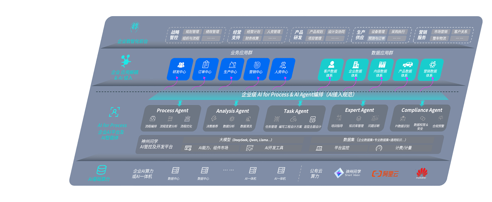 端到端的一站式AI工作空间深度融合了从企业战略规划到日常经营的全流程业务板块,,,,定向解决车企内部领域多、、部门多、、链条长、、、场景碎片化等难题,,支持车企快速构建以AI为核心的生产力写作体系,,,实现任务执行与AI能力的无缝集成与交互