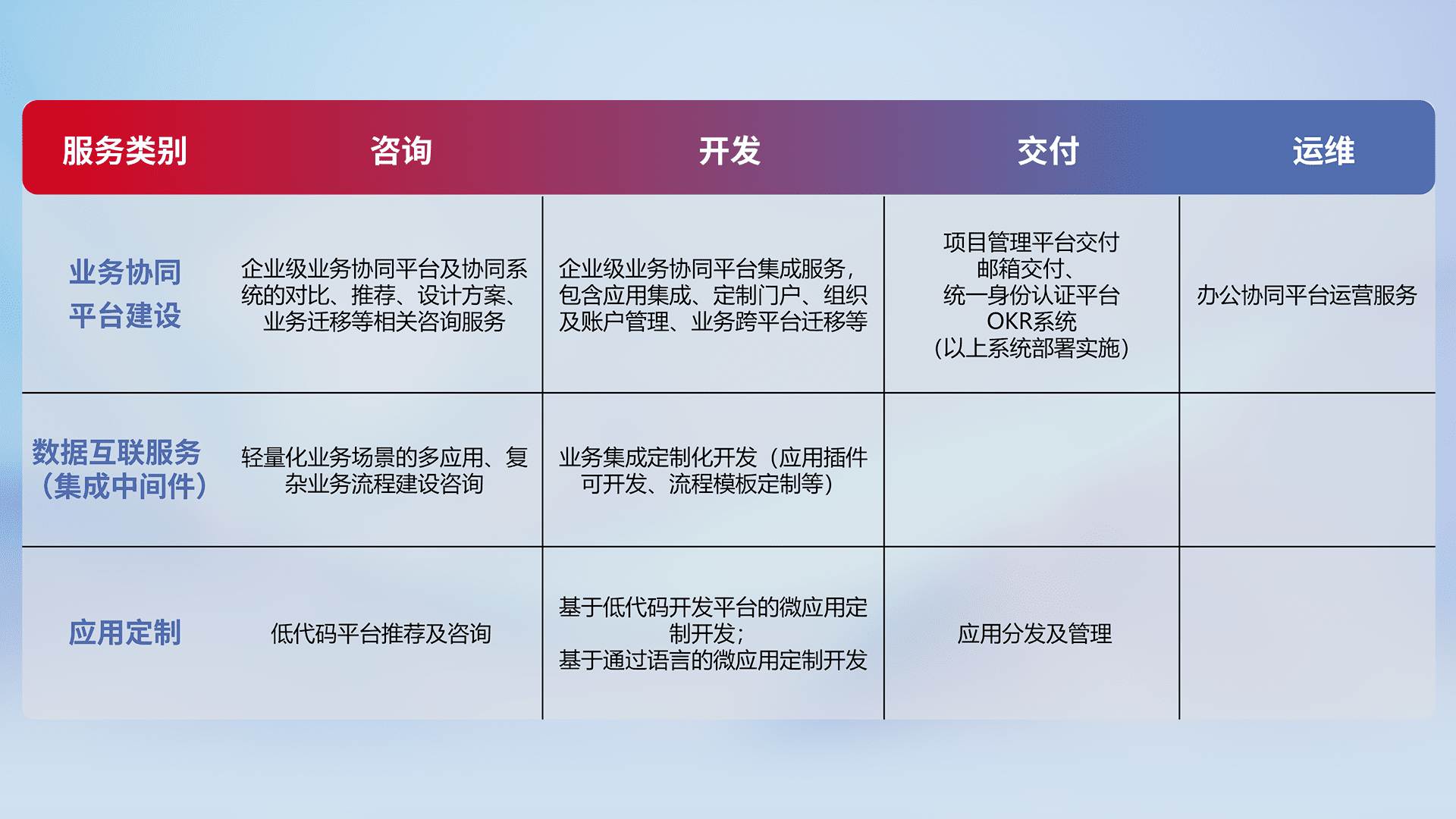 针对钉钉、、企微、、、IDaas等平台级产品提供产品的规划、、、、方案、、交付、、、定制化开发等服务,,,,实现如统一协同办公、、、智能客户服务、、混合会议管理、、、、智能数据查询、、、、等业务场景,,,,实现数字化转型。。。。