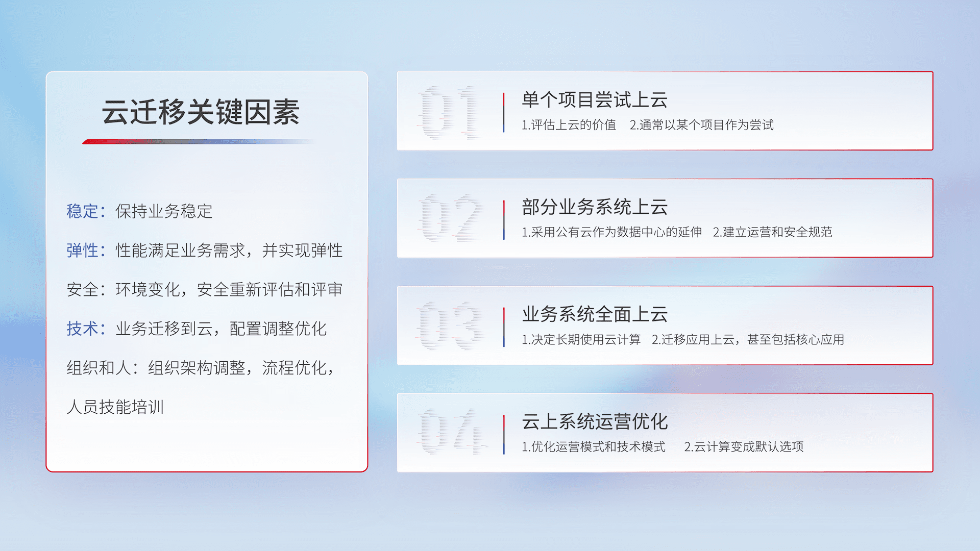 结合实际业务,,,,从规划设计、、云平台选型、、、、云原生改造、、、数据迁移、、、、集成交付,,迁移全过程为客户识别最佳上云路径,,做好风险识别管理,,设计网络架构、、身份权限、、、、安全审计合规、、操作审计、、日志审计、、监控告警策略、、、多站点容灾设计等,,,对云上基础设施进行整体规划,,,提升IT治理水平,,,以满足弹性、、、高可用、、高性能的需求。。。。