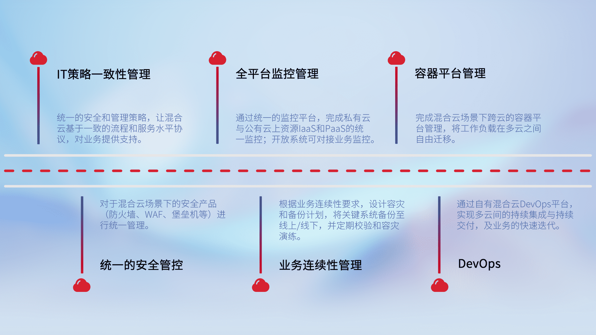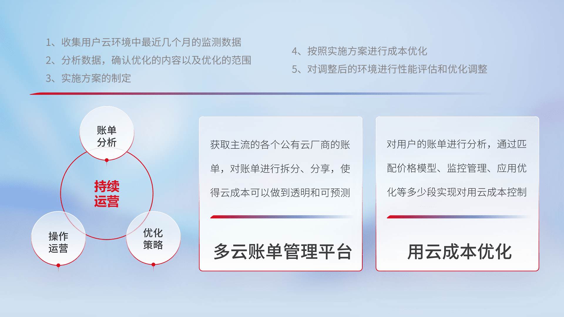 通过多云纳管,,,以统一的资源数据模型把客户的云资源进行抽象和封装,,进而实现对多云资源的统一操作,,,保障云资源管理的可靠性、、、稳定性与可用性。。。。量身定制化运维内容,,,,配置、、、开发运维、、、补丁管理、、备份、、、、监控、、、、认证和访问管理、、、审计和日常巡检等,,,,保障在用云过程中的可靠度,,,,稳定度以及高可用率。。